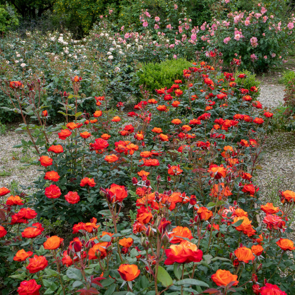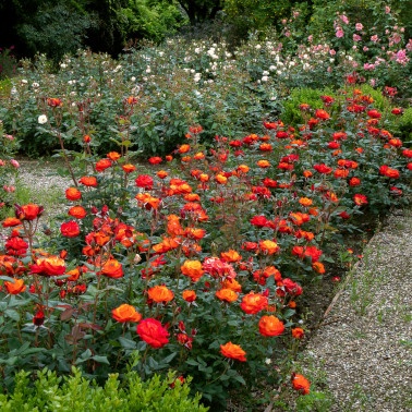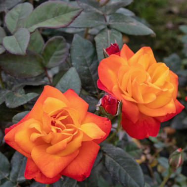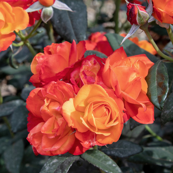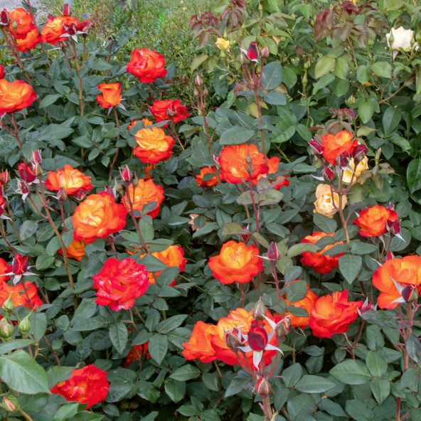It has been awarded a prize as the best italian rose in the Contest of Monza in the 1996. ||It is difficult to describe the flaming clour of this new floribunda, which, during the evolution from the bud to the open flower, goes from golden yellow to deep vermilion orange, changing continously the intermediate tonalities. Vigour, resistance to the diseases and immediate blooming are further qualities of this beautiful rose. Slightly fragrant. Height cm. 60/80. ||