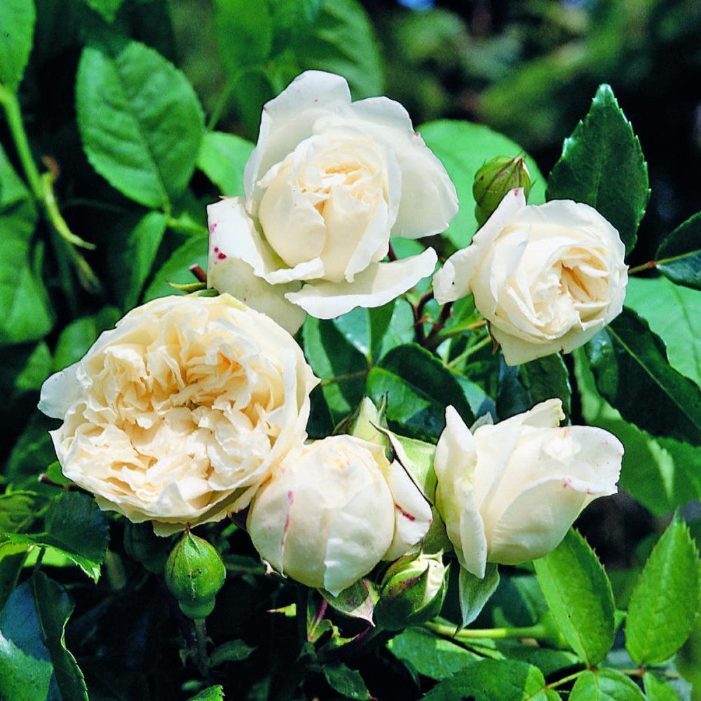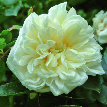 Graceful, fully double flowers, creamy white and in small clusters. Fruit fragrance. Shiny foliage almost evergreen. ||Very strong growth.