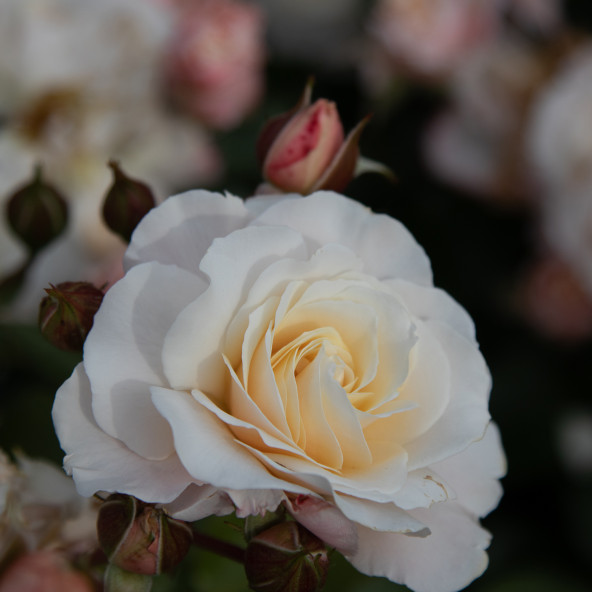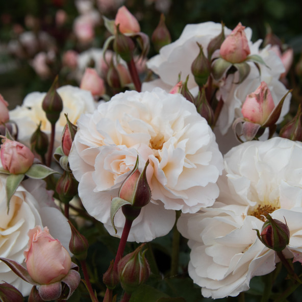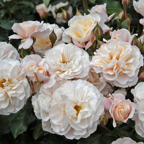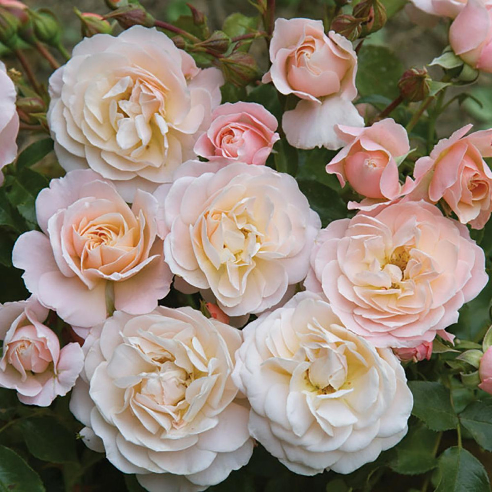 Fiori a mazzi molto rifiorente. Colore delicato rosa soffuso albicocca. Cespuglio compatto.Altezza 60/80.