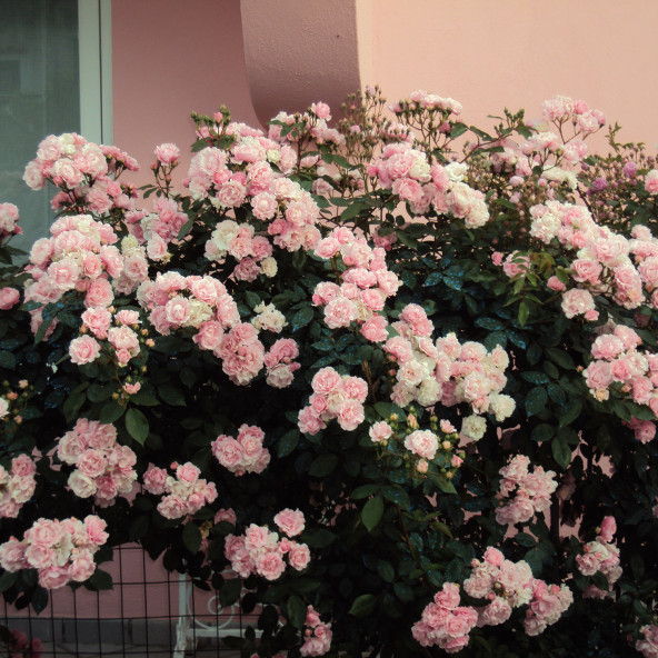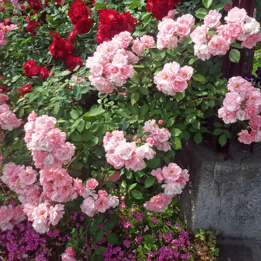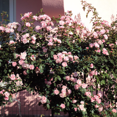 E la prima varietà a vegetazione ricadente "senza spine". I fiori sono grandi, doppi, di colore salmone chiaro al centro, con tonalità di rosa pastello sui petali esterni. Pianta vigorosa e rifiorente. Leggermente profumata. Altezza cm. 50/70. ||||