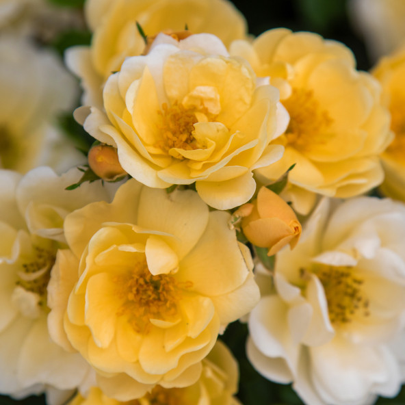 Rosa tappezzante molto rifiorente fino ad autunno. Massa di fiori di un luminoso color giallo crema.