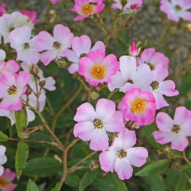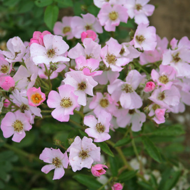Piccoli fiori, portati in grossi corimbi, rosa chiaro al centro bianco.Vigorosa e rifiorente.