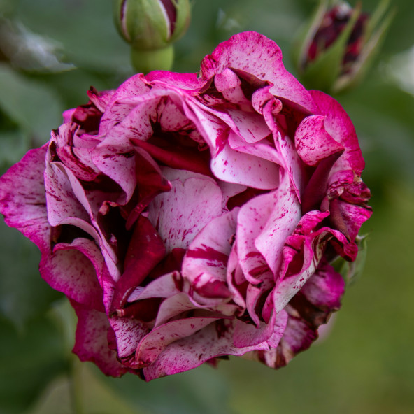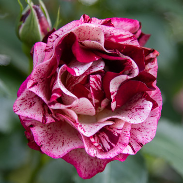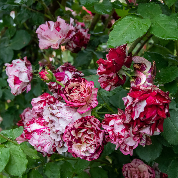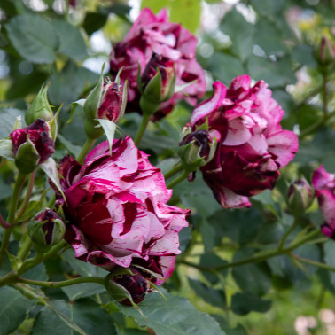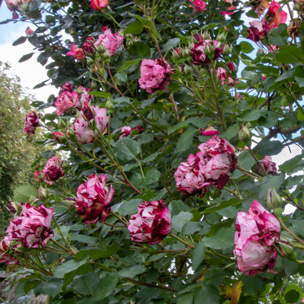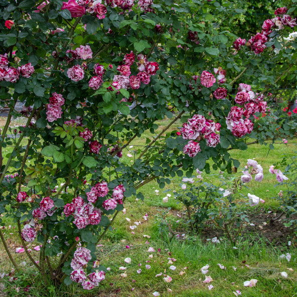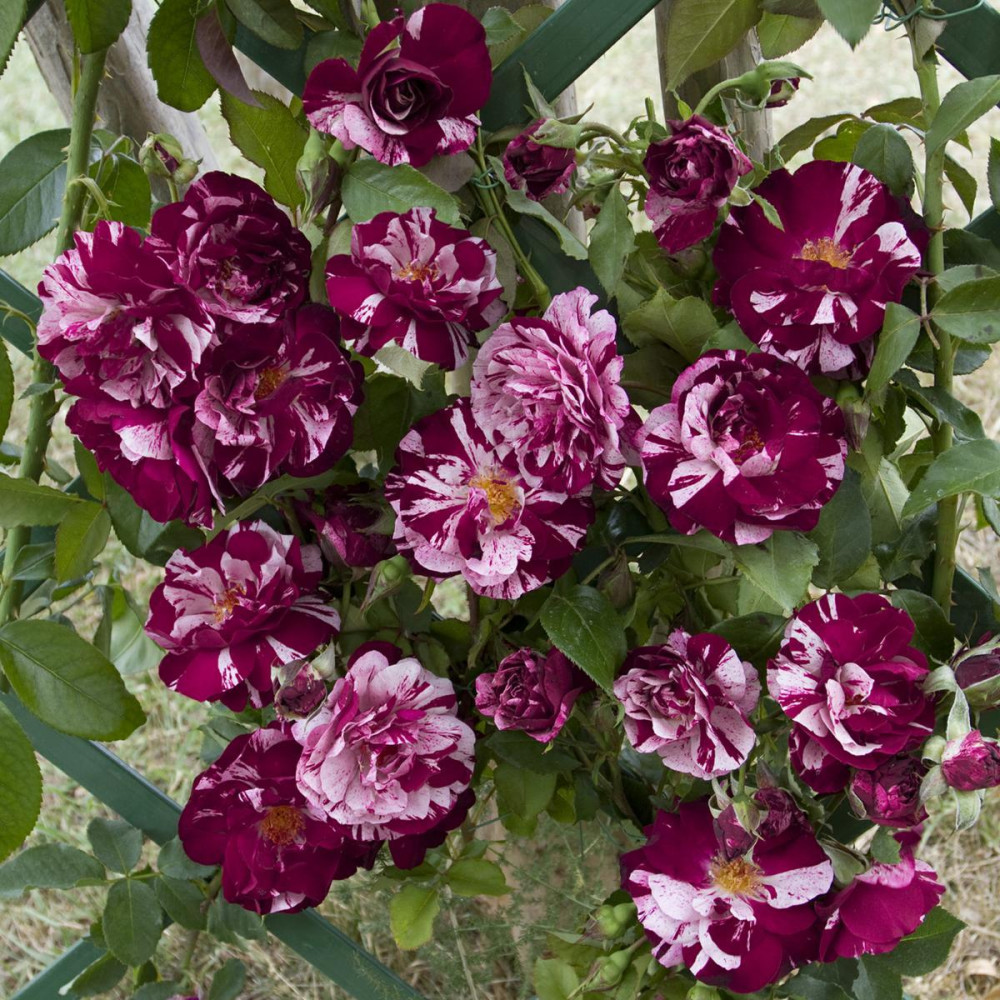 Rampicante rifiorente contenuta con copertura fin dal basso. Ideale per spazi contenuti. Colore insolito striato viola porpora e crema. Profumatissima. Le piante fornite a radici nude fioriscono il secondo anno di impianto.