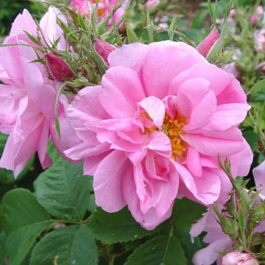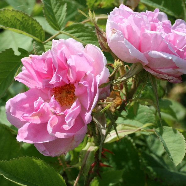 Damascena molto antica, fiori quasi doppi, rosa. Profumo intenso. Seconda fioritura in autunno.