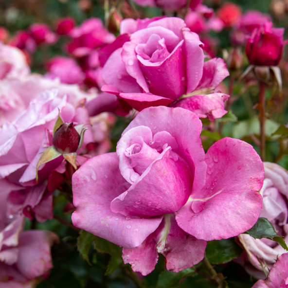 I fiori eleganti e ben formati mostrano una straordinaria tonalità lavanda-malva, ma il carattere più prestigioso di questa rosa è il profumo assai intenso e persistente. Gli steli si presentano quasi senza spine e possono essere comodamente recisi. Cespuglio vigoroso e resistente, con fogliame largo e folto.||Altezza cm 80/100.||Fornito a radici nude o in vaso diam 18.
