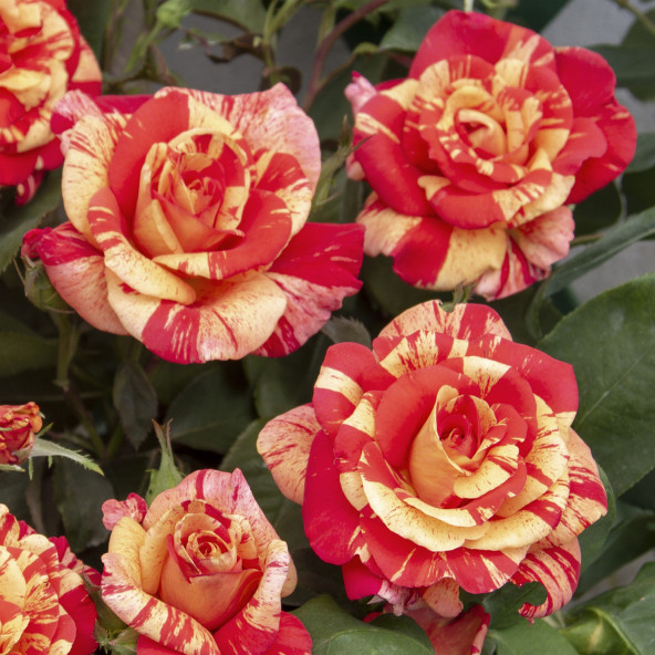 Rosa rampicante a fiore grande. Colore originale e brillante. Fiore striato giallo e rosso. Le piante fornite a radice nuda fioriscono al secondo anno di trapianto.