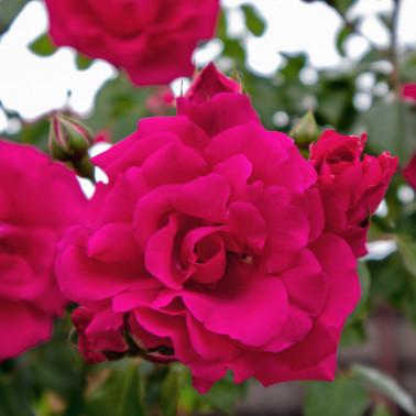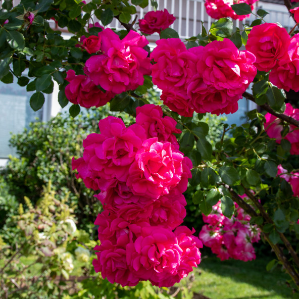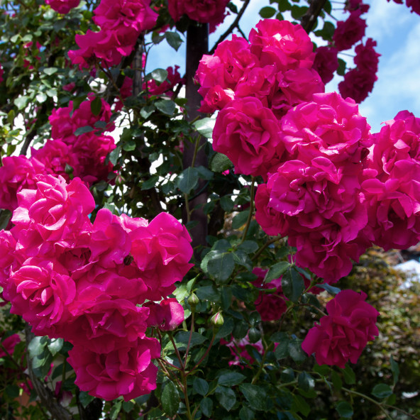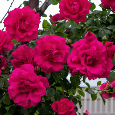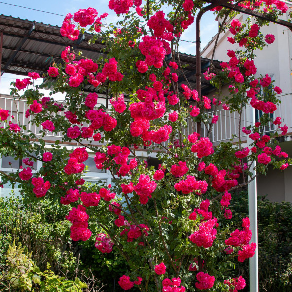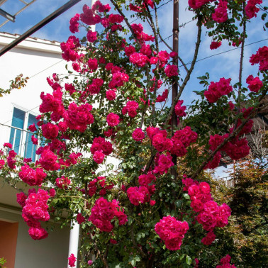 Rampicante con fiori a mazzi. Colore acceso di effetto rosa carminio vivo. Le piante fornite a radici nude fioriscono al secondo anno di impianto.